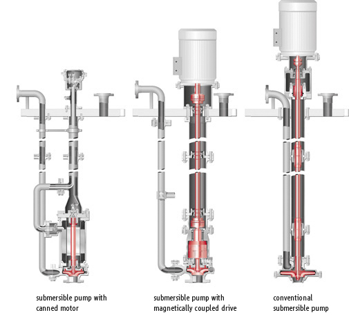 Canned motor pumps are preferred selection for the high installation depth, as there are not guide bearings and no seals. Motor is completely submerged onto the liquid.